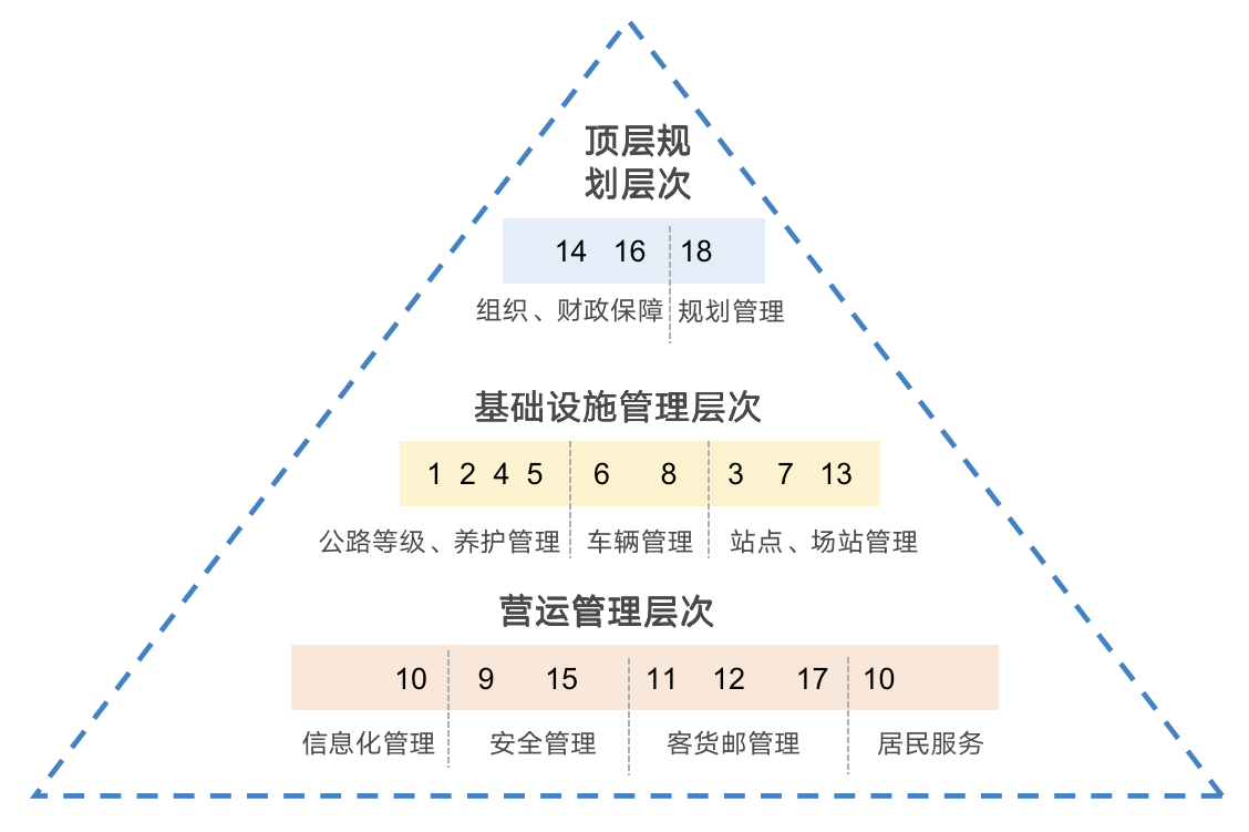 “指標(biāo)體系”中的20個考核指標(biāo),按作用主體不同可分為頂層規(guī)劃(包括組織、財政保障、規(guī)劃管理等)、基礎(chǔ)設(shè)施管理(包括公路、車輛、站點、場站管理等)、信息化管理(營運、安全、客貨郵、居民服務(wù)等)三個層次。